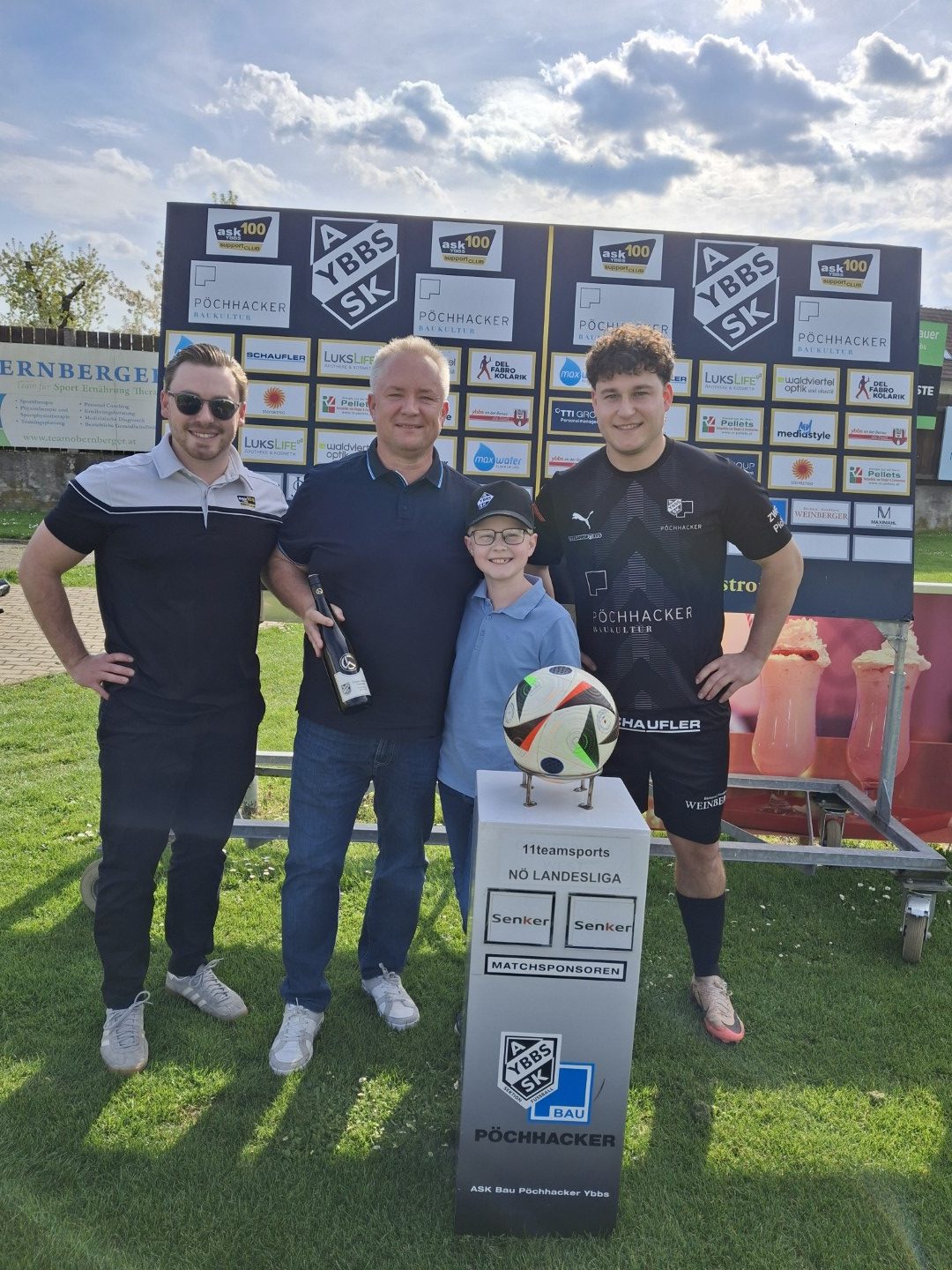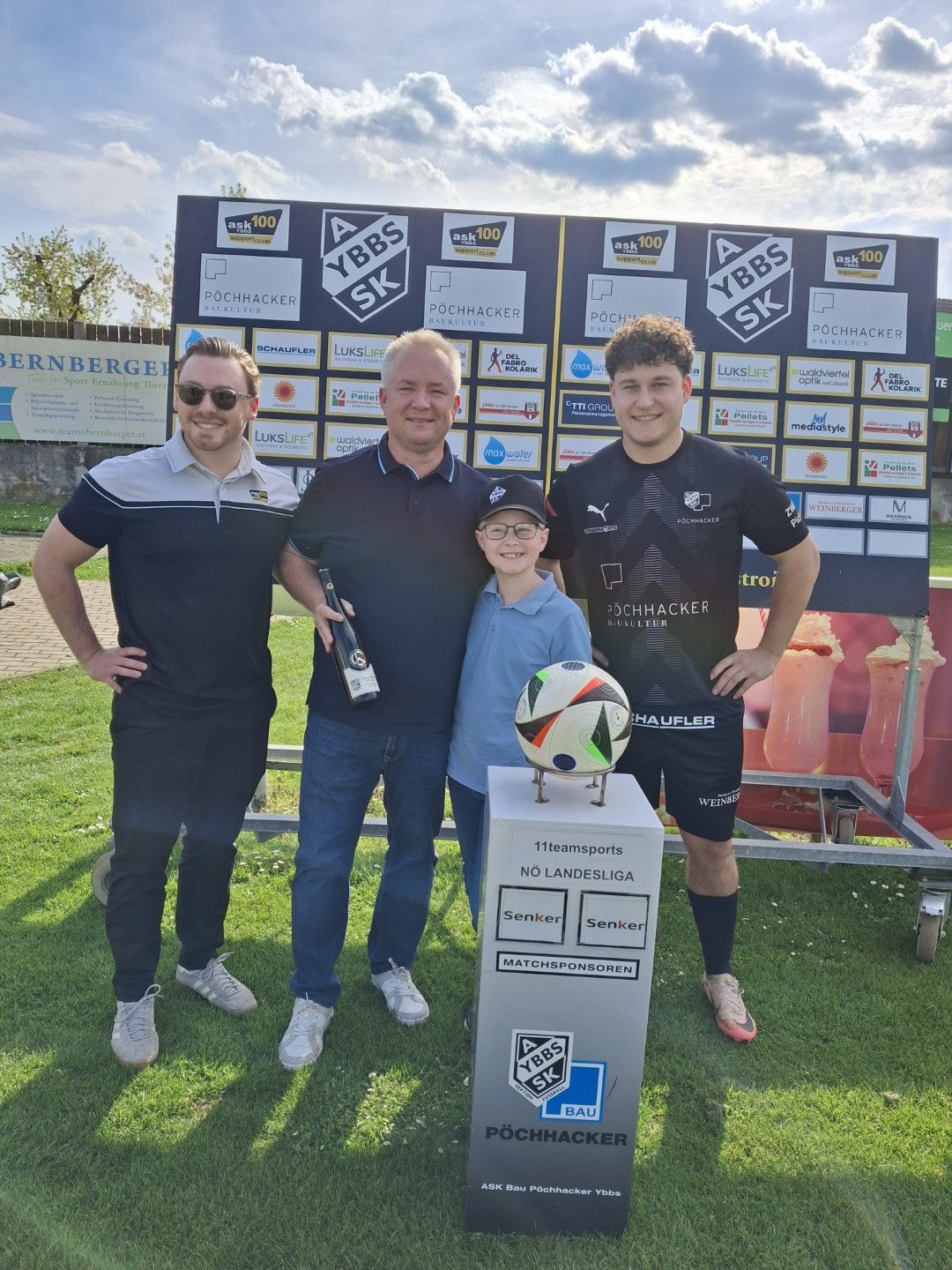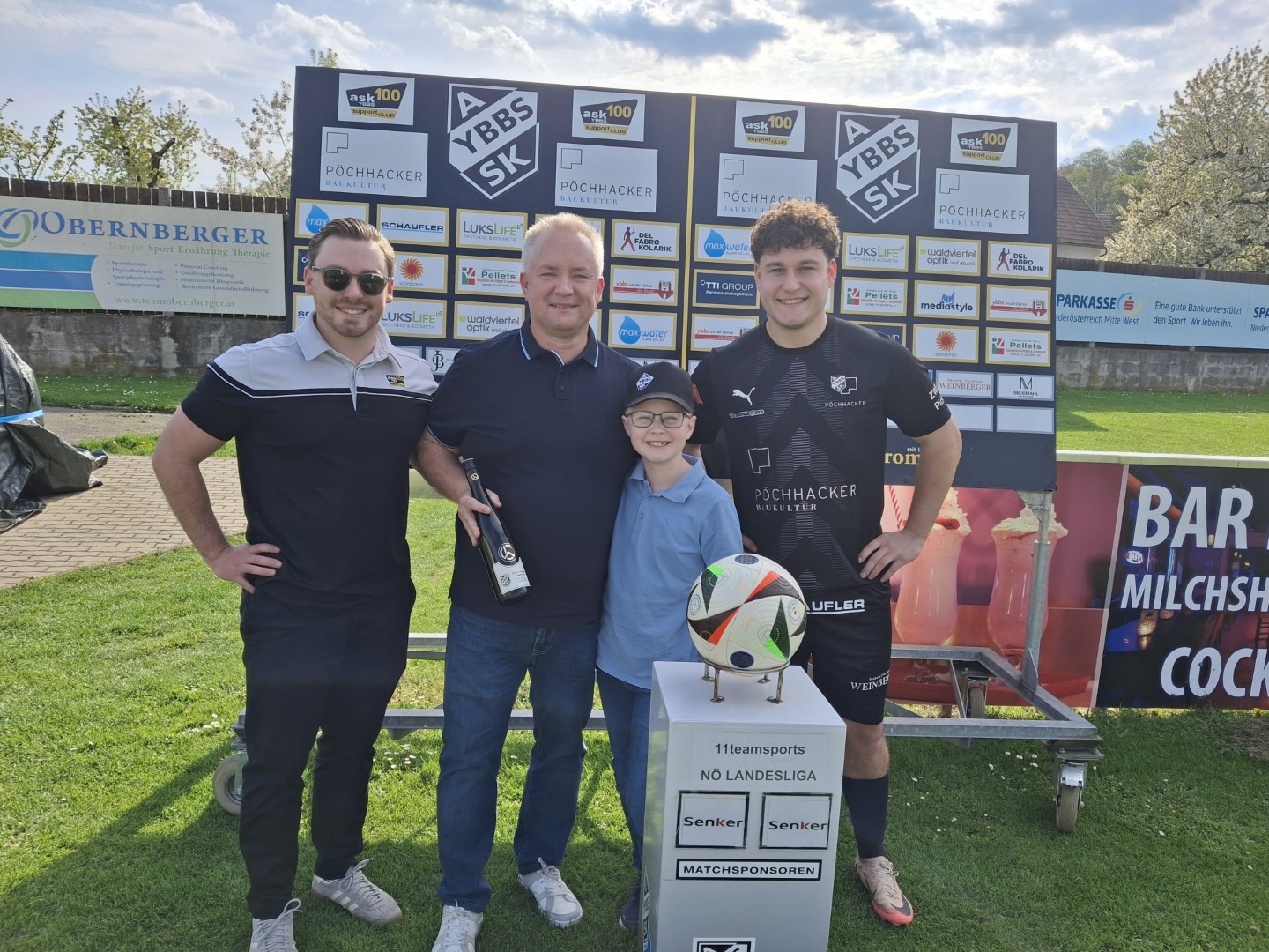 Der ASK Bau Pöchhacker Ybbs bedankt sich beim Autohaus Senker für die Übernahme von Matchballspende und Matchpatronanz. Den Ehrenankick nahmen Niederlassungsleiter Markus Langer mit seinem Sohn Paul vor.