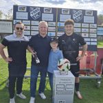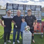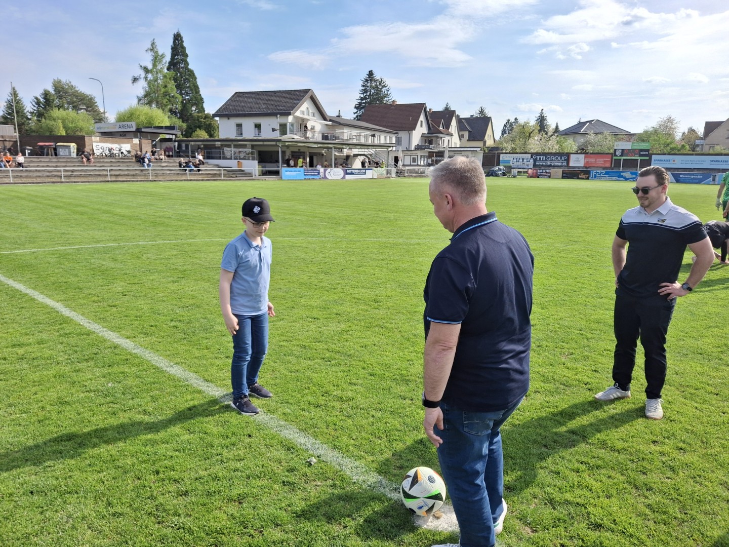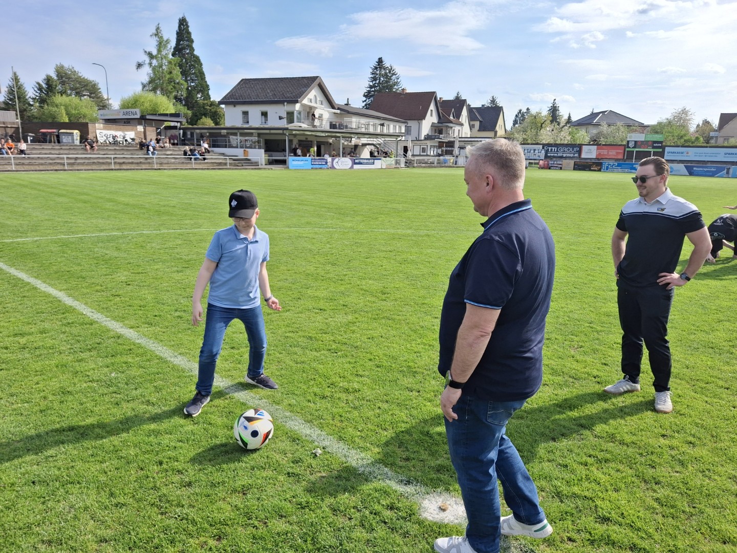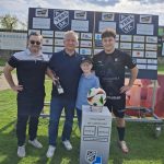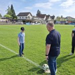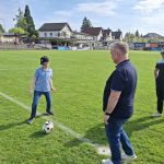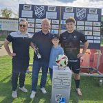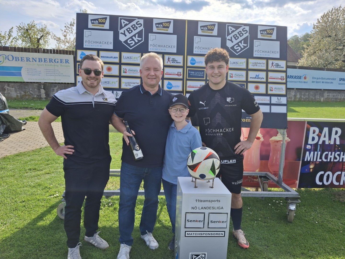 Der ASK Bau Pöchhacker Ybbs bedankt sich beim Autohaus Senker für die Übernahme von Matchballspende und Matchpatronanz. Den Ehrenankick nahmen Niederlassungsleiter Markus Langer mit seinem Sohn Paul vor.